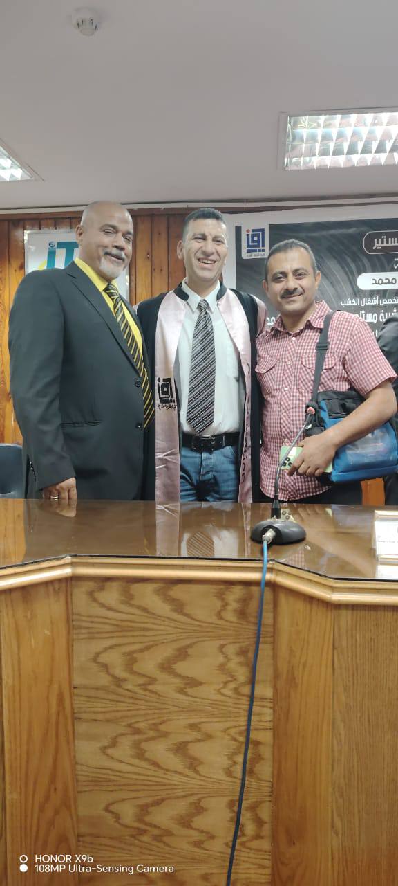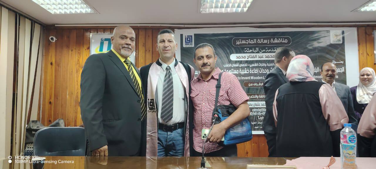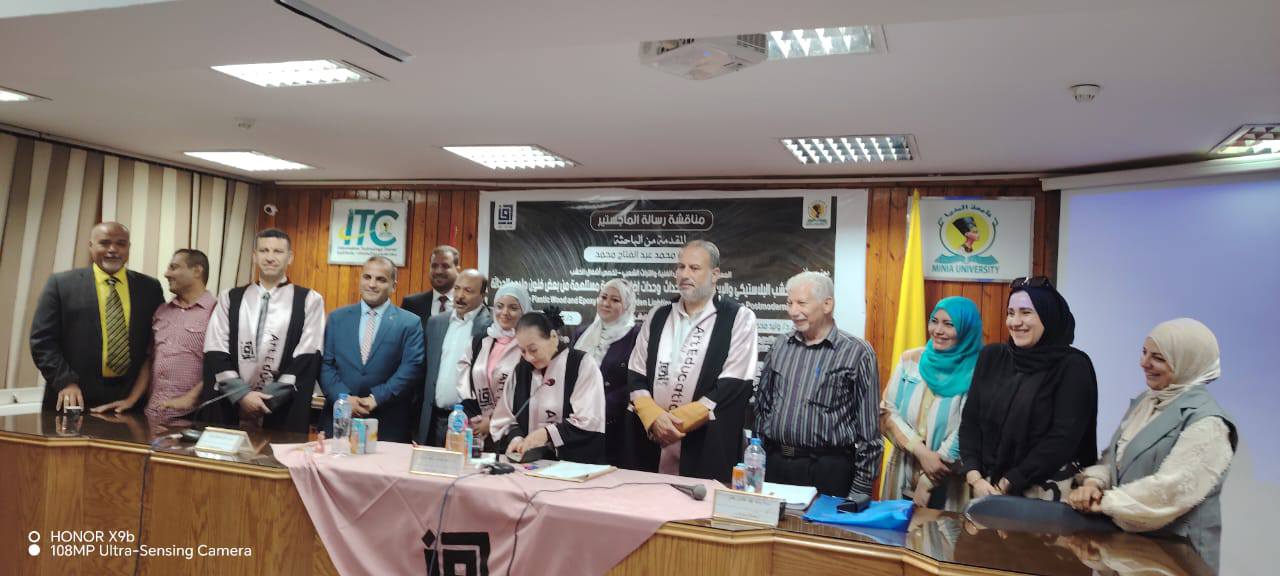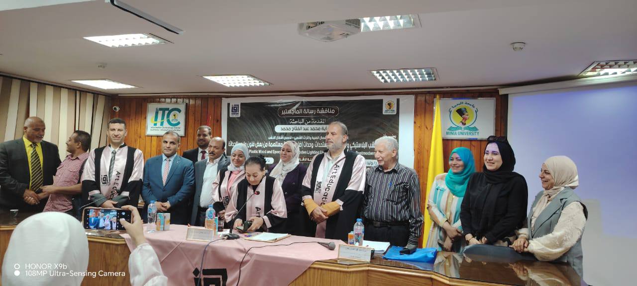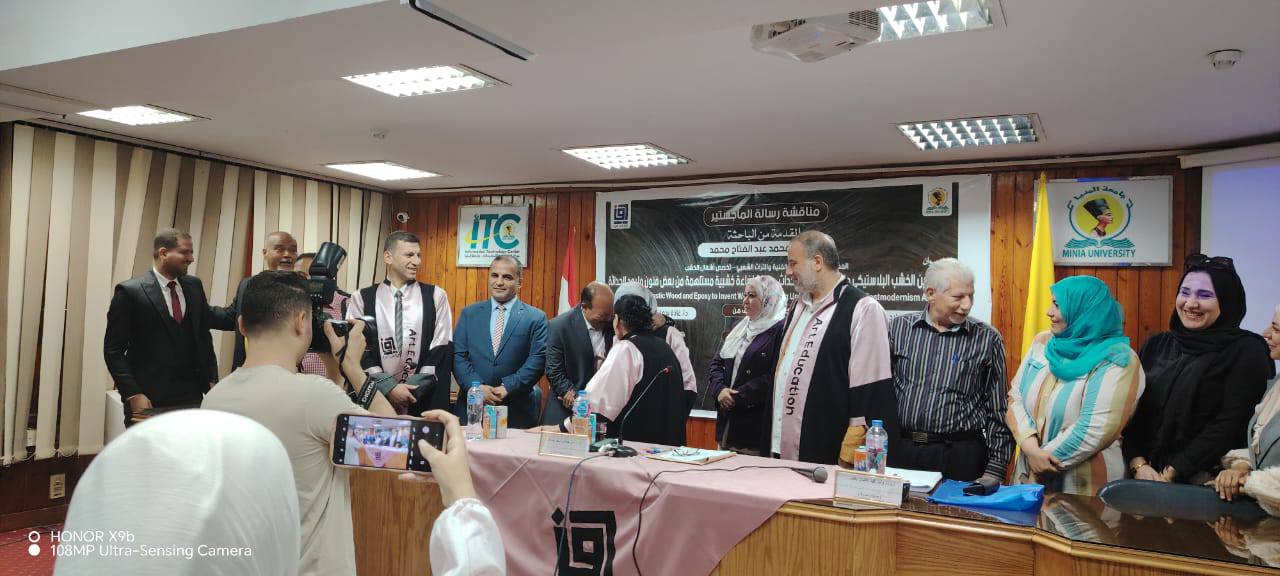 استقبل اليوم الأستاذ الدكتور/ محمود محمد فرج القائم بعمل عميد كلية التربية الفنية جامعة المنيا، لجنة الحكم والمناقشة الخاصة بالباحثة / أية محمد عبد الفتاح المعيده بقسم الاشغال الفنيه والتراث الشعبي بالكلية لمناقشة رسالة الماجستير بعنوان : الجمع بين الخشب البلاستيكي والايبوكسي لاستحداث وحدات اضاءه خشبيه مستلهمه من بعض فنون ما بعد الحداثه وتكونت لجنة الاشراف والمناقشة والحكم من ، ا.د/ آمال حمدي اسعد عرفات أستاذ الأشغال الفنيه والتراث الشعبي المتفرغ بكلية التربية الفنية جامعة المنيا ، ا.د/ وليد محمد عثمان أستاذ أشغال الخشب المساعد بكلية التربية الفنية جامعة حلوان ، ا.د/ رافع اسماعيل رافع أستاذ اشغال الخشب المساعد بكلية التربية الفنية جامعة حلوان ، د/ غادة بدوي محمد مدرس أشغال الخشب بكلية التربية الفنية جامعة المنيا . كل التحية والتقدير للجنة الحكم والمناقشة وألف مبروك للباحثة