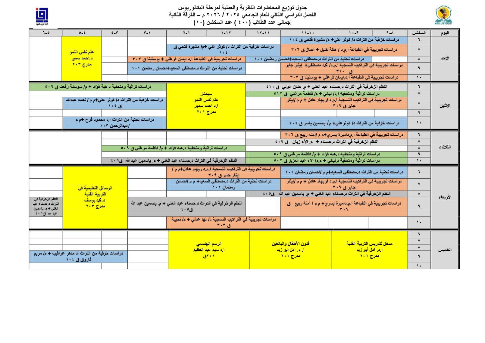 جدول محاضرات الفرقة الثانية بكلية التربية الفنية للفصل الدراسي الثاني 2025/ 2026م