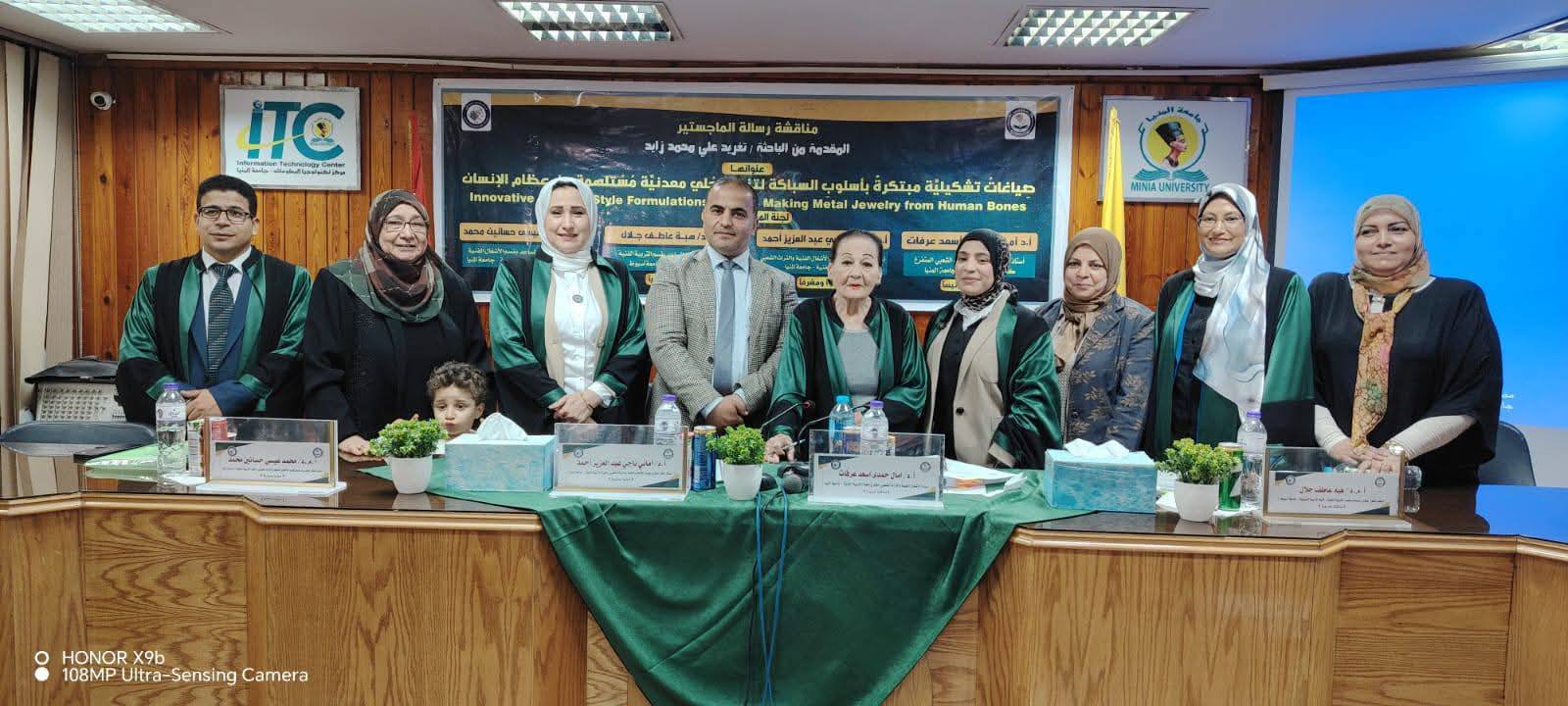 استقبل السيد الأستاذ الدكتور/ محمود محمد فرج – عميد كلية التربية الفنية بجامعة المنيا، والسادة الوكلاء، لجنة الحكم والمناقشة الخاصة بالباحثة/ تغريد علي محمد، الباحثة بقسم الأشغال الفنية والتراث الشعبي، وذلك لمناقشة رسالة الماجستير بعنوان: "صياغات تشكيلية مبتكرة بأسلوب السباكة لتنفيذ حُلي معدنية مستلهمة من عظام الإنسان" وذلك يوم الثلاثاء الموافق 21/4/2026. وقد تشكلت لجنة المناقشة والحكم من السادة: أ.د/ آمال حمدي أسعد عرفات – أستاذ الأشغال الفنية والتراث الشعبي المتفرغ بكلية التربية الفنية – جامعة المنيا. أ.د/ أماني ناجي عبد العزيز – أستاذ أشغال المعادن بكلية التربية الفنية – جامعة المنيا. أ.د/ محمد عيسى حسنين – أستاذ أشغال المعادن المساعد بكلية التربية الفنية – جامعة المنيا. أ.د/ هبة عاطف جلال – أستاذ أشغال المعادن المساعد بكلية التربية النوعية – جامعة أسيوط. وتتقدم كلية التربية الفنية بخالص التحية والتقدير للسادة أعضاء لجنة المناقشة والحكم، مع أطيب التهاني للباحثة، متمنين لها دوام التوفيق والنجاح .