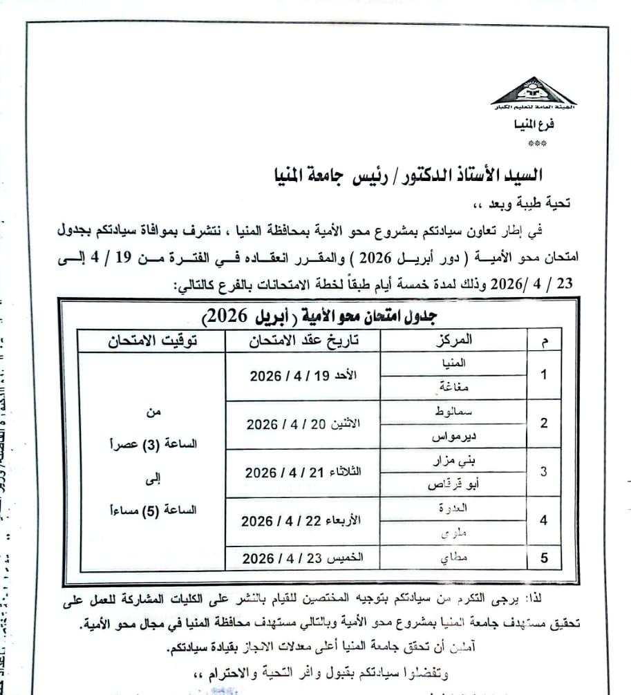 جدول امتحانات محو الأمية لدور أبريل 2026